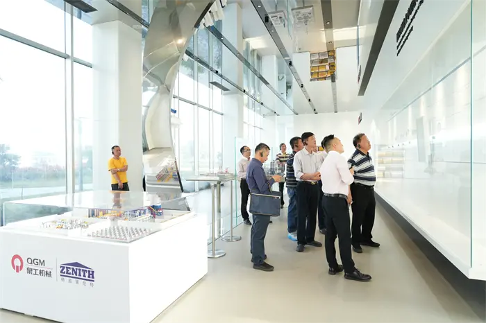 Le président Lin Boqian et sa délégation ont d'abord visité la salle d'exposition sur l'histoire du développement de Quangong Co., Ltd., et grâce à des panneaux d'affichage graphiques, du matériel vidéo et des expositions physiques, ils ont pleinement compris la lutte de l'entreprise depuis sa création pour devenir un leader de l'industrie. Le responsable de Quangong a présenté en détail les percées innovantes que Quangong Co., Ltd. a réalisées dans le domaine des équipements de machines à briques depuis plus de 40 ans, ainsi que la philosophie d'entreprise selon laquelle « l'artisanat crée la qualité et la technologie mène l'avenir ». Le président Lin Boqian a hautement apprécié les réalisations de Quangong Co., Ltd. en insistant sur la recherche et le développement technologique et en promouvant la modernisation de l'industrie.