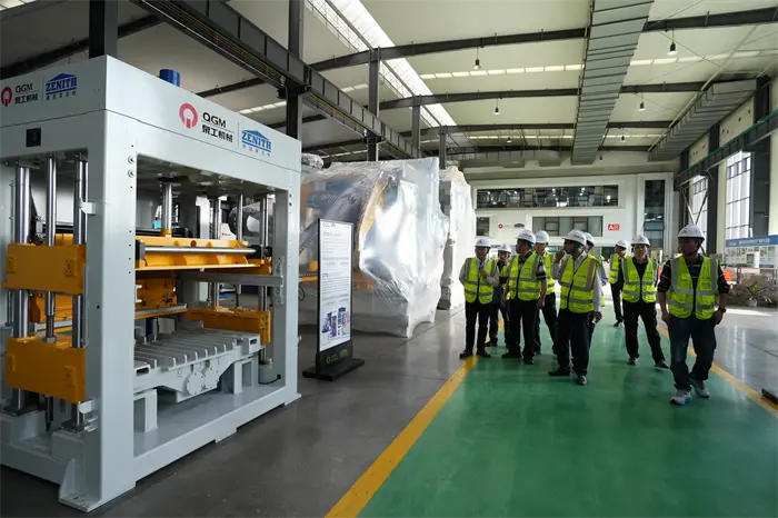 Ensuite, les invités se sont rendus dans la zone d'exposition d'échantillons de briques et ont observé diverses briques perméables, briques de chaussée, blocs et autres produits de haute qualité fabriqués par les équipements QGM, et ont exprimé un grand intérêt pour les réalisations technologiques de l'entreprise en matière de « recyclage des déchets solides ». Dans la zone d'exposition des équipements de fabrication de briques, le président Lin Boqian et son équipe ont inspecté de près les équipements de base tels que la machine de formage de blocs entièrement automatique et la ligne de production intelligente développée indépendamment par QGM, et ont échangé sur place les avantages techniques et les perspectives d'application du marché. Le président Lin Bo a pleinement affirmé les contributions exceptionnelles de QGM dans les domaines de la fabrication d'équipements haut de gamme et des matériaux de construction écologiques, et a souligné : « QGM est un modèle innovant d'entreprises privées à Quanzhou. Nous espérons jouer davantage le rôle de fédération en tant que pont à l'avenir, promouvoir le développement coordonné de la chaîne industrielle et aider « Quanzhou Smart Manufacturing » à se mondialiser. Le directeur général adjoint Fu Huabin a répondu que l'entreprise continuerait d'augmenter ses investissements dans la recherche et le développement et de travailler avec des partenaires de tous horizons pour explorer de nouvelles opportunités pour le développement intégré d'équipements intelligents et de fabrication verte.