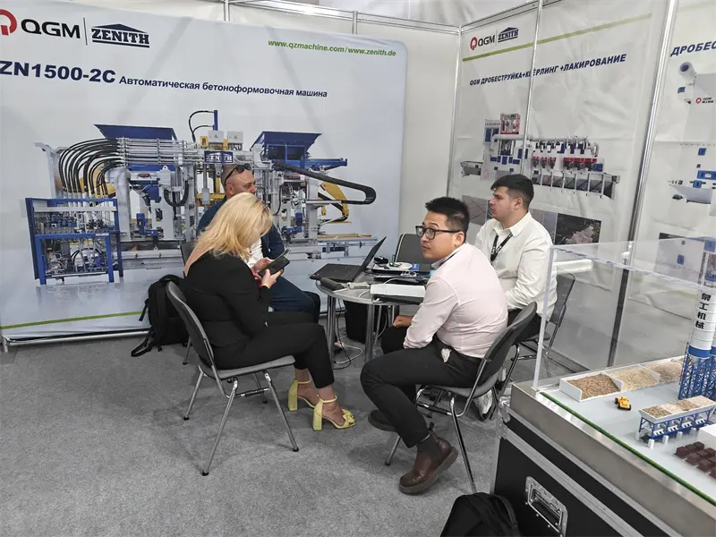 Pendant l'exposition, l'équipe marketing localisée de QGM en Russie a fourni des services professionnels de conseil en produits et des analyses de cas réussies aux clients de l'industrie qui sont venus au stand, démontrant la profonde force technique de QGM et sa riche expérience pratique dans l'industrie du béton. Parallèlement, au cours du processus de contact, l'équipe marketing de QGM a également partagé le développement de l'industrie de la fabrication de briques, les tendances du marché et les expériences réussies avec les clients de l'industrie en visite.